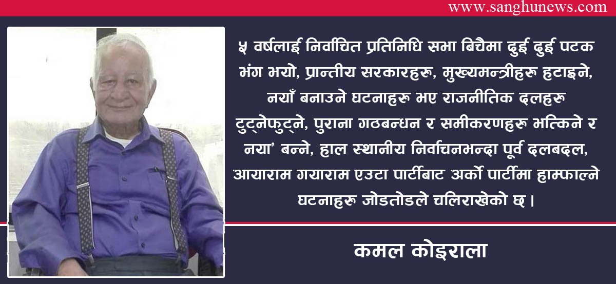 नेपाली कांग्रेसका नेता सुशील कोइराला राष्ट्रपतिजस्तो कार्यकारी शक्ति नभएको पद होइन, प्रधानमन्त्री नै रहिरहने यसका लागि महन्थ ठाकुर, राजेन्द्र महतोलगायतका मधेसी र अन्यको समेत सहयोग प्राप्त हुने झुटो प्रलोभनमा पारियो । नेपाली कांग्रेस सरकारबाट अलग भयो । तर, न त सुशील कोइरला प्रधानमन्त्री, न त राष्ट्रपति भए । अर्काेतिर अर्काे छिमेकी शक्तिले नेकपा (एमाले) र नेकपा (माओवादी)को गठबन्धन बनाउँदा दुबै लाभान्वित हुन प्रेरित गर्न सफल भयो । नतिजा यो नयाँ एकताको हामी नेपाली जनताले प्रत्यक्ष देख्यौं । राष्ट्रवादको लहरमा सवार भएर झण्डै दुई तिहाई प्रबल बहुमत साथ नेपालमा कम्युनिष्ट नाम राखेका दलहरुको गठबन्धनको जित भयो ।